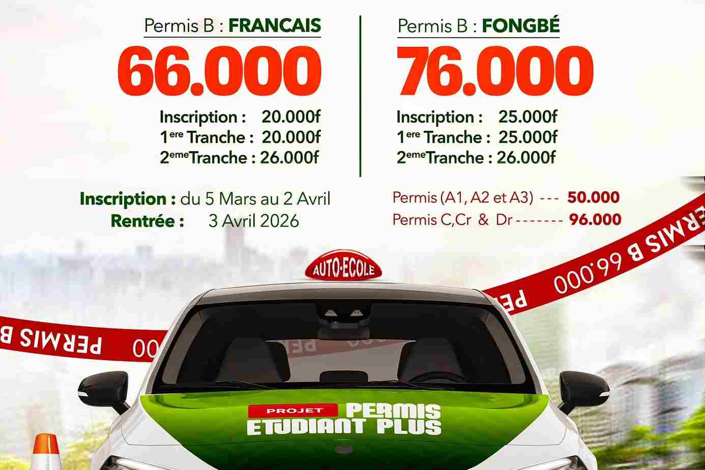Les inscriptions sont officiellement ouvertes et concernent plusieurs catégories de permis. Pour le permis B en français, le coût total est fixé à 66 000 FCFA, réparti en trois tranches : 20 000 FCFA à l’inscription, 20 000 FCFA en première tranche et 26 000 FCFA en seconde tranche. La formule en langue nationale fon (Permis B en Fongbé) est proposée à 76 000 FCFA, avec un paiement échelonné similaire.