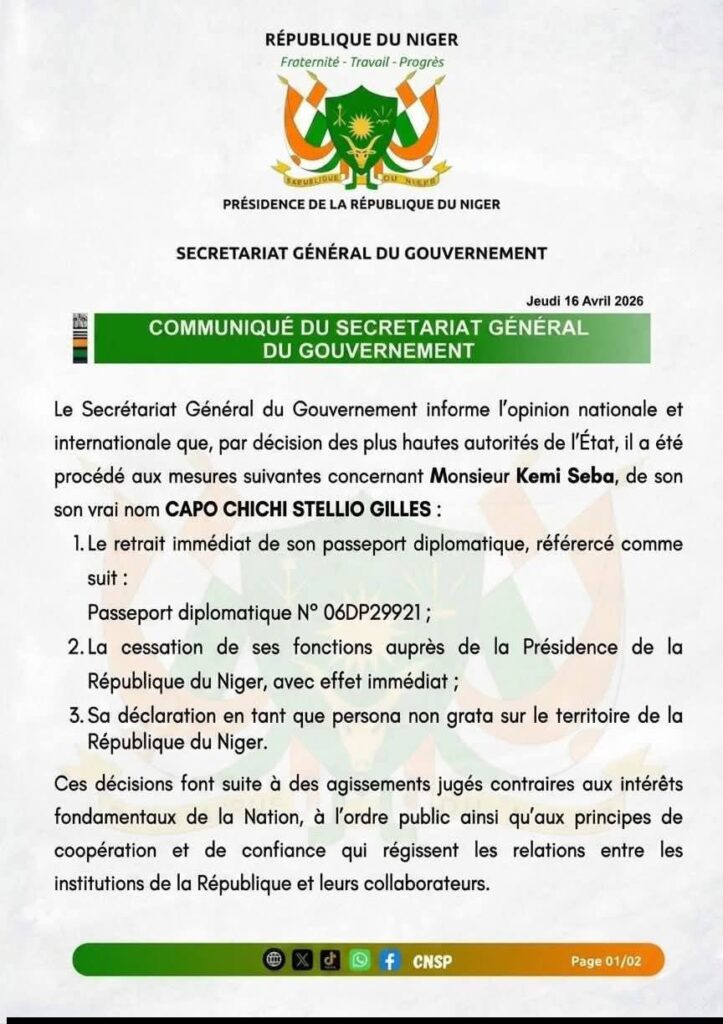 Au lendemain de l’arrestation de Kemi Seba en Afrique du Sud, le Niger a annoncé le retrait de son passeport diplomatique ce jeudi 16 avril 2026.