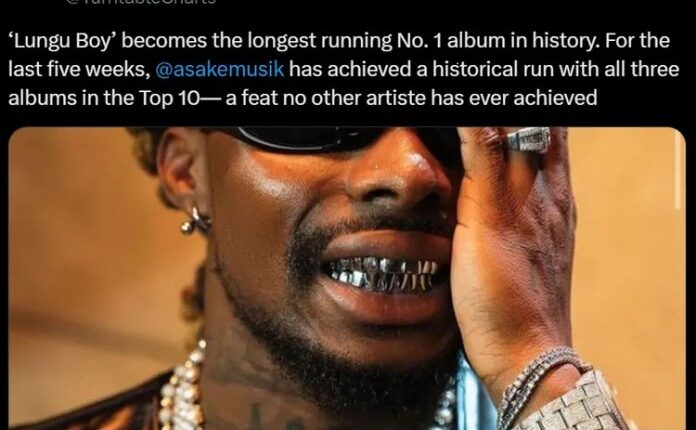 L’Artiste nigérian Asake continue de faire rayonner la musique populaire du Nigeria. Il vient de battre un nouveau record avec son troisième album,”Lungu Boy”, qui est désormais l’album le plus longtemps classé numéro 1 dans le plus grand classement musical du pays.