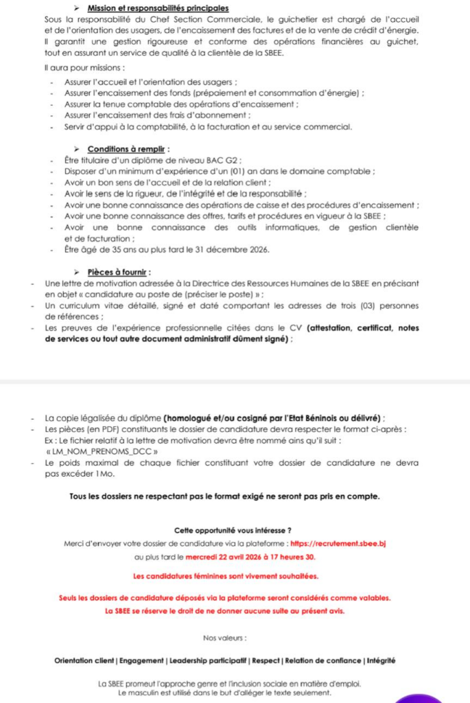 La Société Béninoise d’Énergie Électrique (SBEE) lance un recrutement de 49 agents répartis entre releveurs, agents d’abonnement et guichetiers, afin de renforcer ses équipes sur le terrain et améliorer la qualité de ses services.