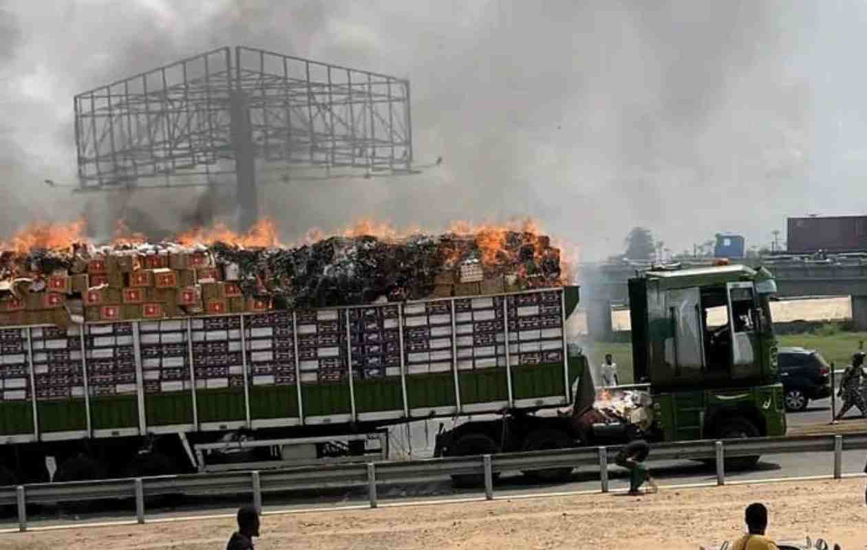 Un camion transportant des cartons de boîtes d’allumettes a pris feu ce mardi 21 avril 2026 en début d’après-midi sur l’échangeur de Godomey, dans la commune d’Abomey-Calavi.