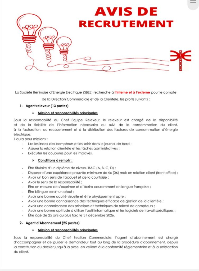La Société Béninoise d’Énergie Électrique (SBEE) lance un recrutement de 49 agents répartis entre releveurs, agents d’abonnement et guichetiers, afin de renforcer ses équipes sur le terrain et améliorer la qualité de ses services.